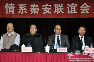 劉天明在講話中說,秦安是一片充滿生機(jī)和活力的土地,淳樸的民風(fēng)和勤勞樸實(shí)的人民給我留下深刻的印象。秦安人民淳樸善良,智慧勤勞,在非常嚴(yán)酷的自然環(huán)境下,與天斗、與地斗,形成了“人一之,己十之;人十之,己百之”的秦安精神。如果沒有這種精神,那一方水土真的養(yǎng)活不了那一方人。這么多的優(yōu)秀人才在北京學(xué)習(xí)工作,充分昭示著秦安發(fā)展的潛力是巨大的。他表示,省政府駐京辦將為北京·情系秦安聯(lián)誼會(huì)的運(yùn)行和發(fā)展給予大力支持和幫助。他祝愿聯(lián)誼會(huì)發(fā)揮更大的橋梁和紐帶作用,為秦安的發(fā)展做出積極貢獻(xiàn)。