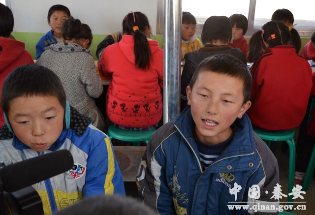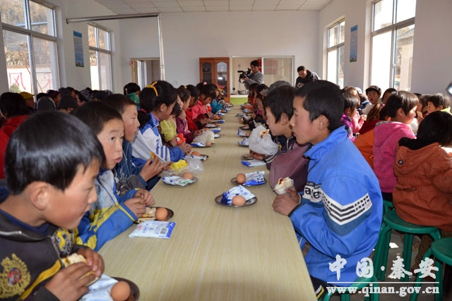當(dāng)我們來到大莊小學(xué)時,正好碰上中午學(xué)生們吃早餐的時間,走進(jìn)食堂,看到食堂寬敞明亮,桌椅整齊潔凈,學(xué)生組長和老師們正在往桌子上擺放早餐奶和雞蛋。筆者問一位正在用餐的學(xué)生:“學(xué)校食堂怎么樣?”“非常棒!自從去年省上的叔叔阿姨們來了后,為我們建起了這座漂亮的大房子后,我們現(xiàn)在吃營養(yǎng)餐舒服多了。”六年級高亞杰回答道。