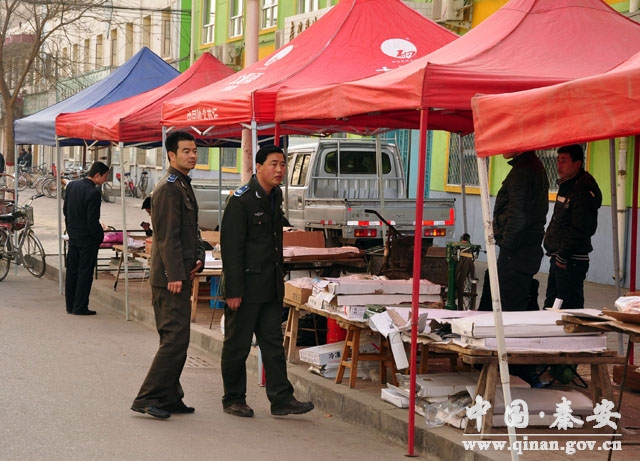 2013年春節(jié)即將來臨,為確保市容整潔、交通順暢,秦安縣采用疏堵并舉的策略,一方面在城區(qū)次主干道旁設(shè)置節(jié)日商品臨時市場,安置節(jié)日期間各類攤點(diǎn),另一方面,加大執(zhí)法力度,嚴(yán)禁各類攤點(diǎn)占用機(jī)動車道擺放,避免交通擁堵的發(fā)生,一疏一堵,占道經(jīng)營影響市容秩序的問題得到有效解決,城區(qū)市容秩序由往年的“無序”變得“有序”。