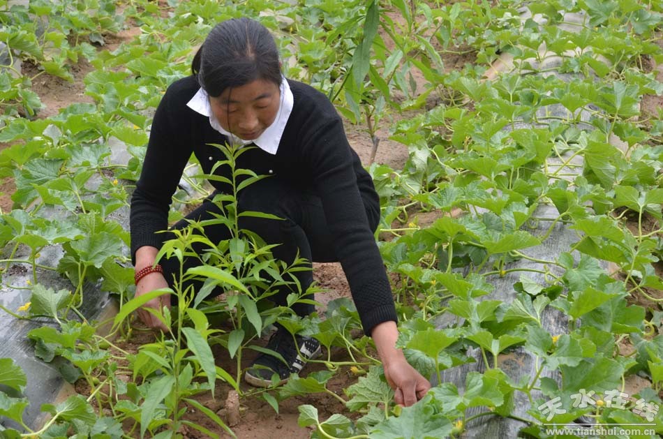 4月7日,秦安縣五營鄉(xiāng)雒塬村的村民正在日光溫室大棚內(nèi)為瓜苗打杈。