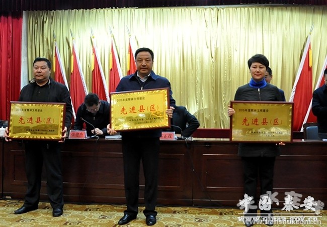 3月2日,在全市宣傳思想工作會(huì)議上,秦安縣榮獲2015年度全市精神文明建設(shè)先進(jìn)縣區(qū)和2015年度全市宣傳思想文化工作先進(jìn)縣區(qū),由秦安縣委宣傳部策劃組織的“相約桃鄉(xiāng)秦安·感受美麗田園”旅游采風(fēng)活動(dòng)榮獲2015年度全市宣傳思想文化工作特色創(chuàng)新獎(jiǎng),秦安縣第二中學(xué)、縣教體局、縣司法局榮獲市級(jí)文明單位,秦安縣王尹鎮(zhèn)榮獲市級(jí)文明鄉(xiāng)鎮(zhèn),秦安縣劉坪鄉(xiāng)大灣村、劉坪鄉(xiāng)黃灣村、王尹鎮(zhèn)胡坪村、興國(guó)鎮(zhèn)康坡村榮獲市級(jí)文明村,秦安縣興國(guó)鎮(zhèn)南關(guān)社區(qū)榮獲市級(jí)文明社區(qū)。