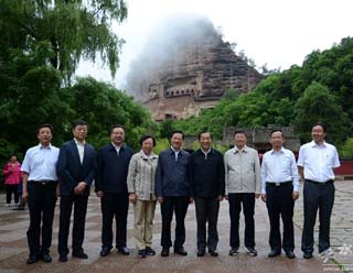 (全國(guó)百家網(wǎng)媒記者團(tuán)在大地灣遺址合影)