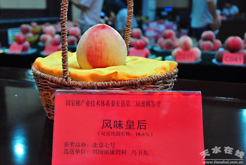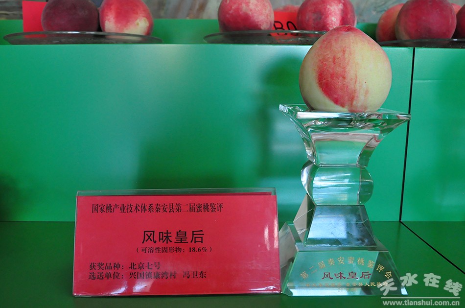 在評選中,鑒評會根據(jù)參賽樣品的果形、果色、單果重、風(fēng)味、可溶性固形物含量等內(nèi)外品質(zhì)進(jìn)行綜合打分,按照得分高低評出了秦安優(yōu)質(zhì)蜜桃精品!疤彝酹劇庇汕匕部h新潤果園獲得,單果重563克;“風(fēng)味皇后獎”由秦安縣興國鎮(zhèn)康灣村馮衛(wèi)東獲得,可溶性固形物18.6%。