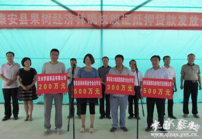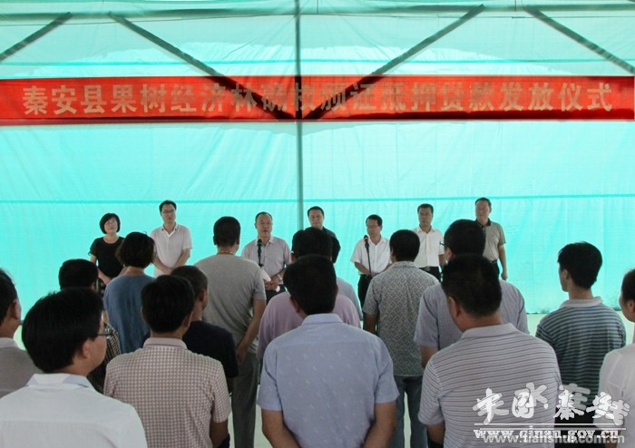 為了切實加快全縣林果產(chǎn)業(yè)發(fā)展步伐,促進果樹經(jīng)濟林確權(quán)頒證抵押貸款工作,有效破解林果種植大戶、專業(yè)合作社發(fā)展融資難瓶頸,全力打贏精準扶貧精準脫貧攻堅戰(zhàn),8月11日,秦安縣在五營鎮(zhèn)臥牛坪蘋果示范基地隆重舉行了秦安縣果樹經(jīng)濟林確權(quán)頒證抵押貸款發(fā)放儀式?h委副書記裴貴軍,甘肅銀行天水支行副行長李晉,以及各鄉(xiāng)(鎮(zhèn))鄉(xiāng)鎮(zhèn)長,農(nóng)業(yè)、林業(yè)、果業(yè)、甘肅銀行秦安支行、新潤農(nóng)業(yè)、保林果業(yè)、夢源果業(yè)、大地家園果蔬合作社等單位和企業(yè)主要負責(zé)人參加,活動由縣委常委、副縣長郭雙江主持。