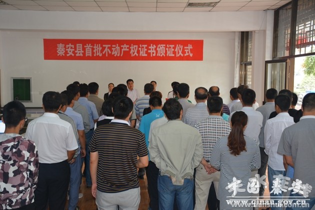 8月30日,秦安縣舉行首批不動(dòng)產(chǎn)權(quán)證書頒證儀式,標(biāo)志著全縣不動(dòng)產(chǎn)統(tǒng)一登記發(fā)證工作正式啟動(dòng)。天水市國土資源局黨組成員、副局長田永和,秦安縣委副書記、縣長程江芬,縣委常委、政法委書記楊喜春,市國土資源局不動(dòng)產(chǎn)管理科、縣政府辦、編委辦、農(nóng)業(yè)局、林業(yè)局、住建局、財(cái)政局、房管局、畜牧局、國稅局、地稅局主要負(fù)責(zé)人,不動(dòng)產(chǎn)權(quán)人代表和三和數(shù)碼測繪院工作人員及縣國土資源局干部職工代表共計(jì)30多人參加了頒證儀式。縣委常委、常務(wù)副縣長任佩光主持頒證儀式。