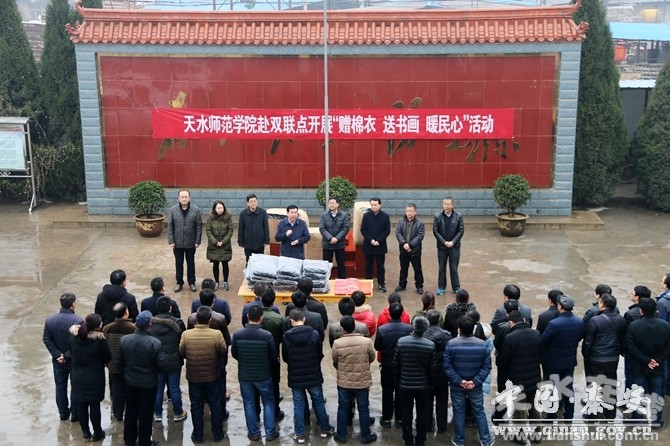 1月6日,天水師范學院黨委書記馬建東、黨委副書記師平安帶領(lǐng)學院組織部、工會、團委、雙聯(lián)辦負責人及學院書畫協(xié)會會員一行20多人,來到秦安縣西川鎮(zhèn)開展“贈棉衣、送書畫、暖民心”雙聯(lián)慰問活動。