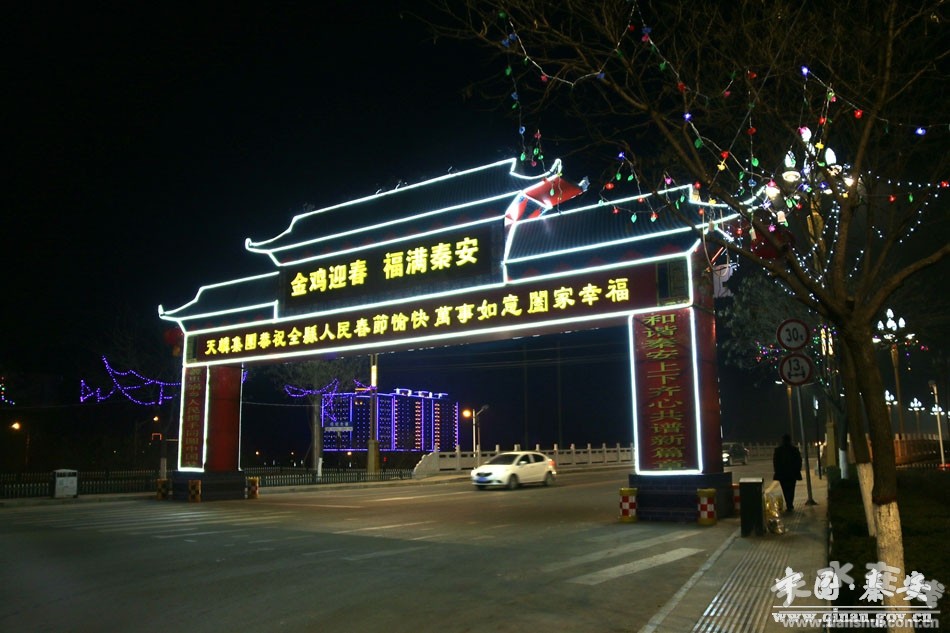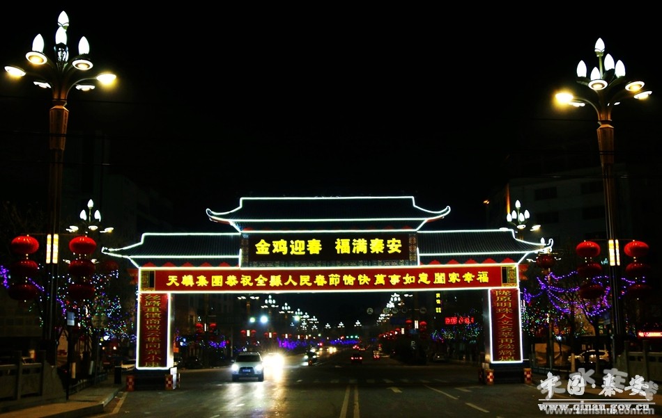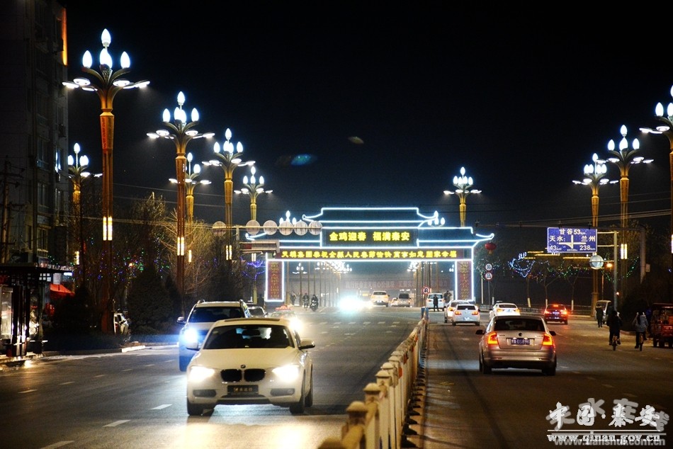 新春佳節(jié)即將來臨,秦安城區(qū)盞盞火紅的大紅燈籠高高掛起,一排排、一串串,一派紅彤彤、喜洋洋的景象。夜幕降臨,道路兩旁典雅的路燈和多彩的LED燈交相輝映,加上璀璨流動(dòng)的車燈,寬闊的道路頓時(shí)成了燈的海洋,絢麗多彩,美不勝收;特別是鳳山景區(qū)花燈璀璨、火樹銀花,給人以美輪美奐的視覺享受,讓穿梭在其間的人們感受到了新年的紅火與溫馨。流光溢彩的秦安夜景分外迷人,色彩豐富、點(diǎn)線結(jié)合、動(dòng)靜相宜的亮化風(fēng)景,把整個(gè)縣城裝扮一新,處處洋溢著紅火、喜慶、祥和的節(jié)日氛圍。