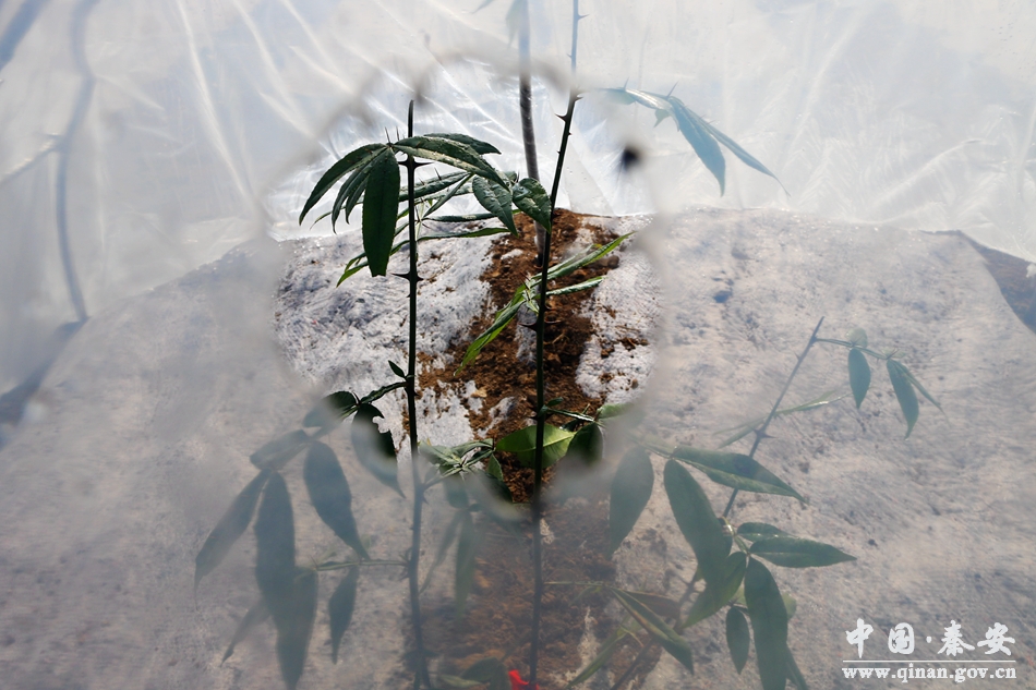 近日,記者走進王窯鎮(zhèn)呂山村看到,在靠近村委會不遠處的一片梯田地全被覆蓋得嚴嚴實實,這就是王窯鎮(zhèn)花椒品種園,走近一看,并非塑料薄膜,而是用兩米多寬的毛毯覆蓋著,起到保濕透氣,抑制雜草的目的,每隔兩米就有一株花椒樹苗用玉米秸桿固定著,樹苗枝干被塑料條袋包裹,只露出樹梢,記者仔細觀察發(fā)現(xiàn),這些花椒與普通花椒樹不一樣,渾身沒有一個刺,據(jù)介紹,這是從日本引進的無刺花椒品種,名叫朝倉,樹姿直立,喬化樹種,植皮光滑無刺,果實出皮率21.89%,每100克果皮含精油15克左右,嫩芽適宜制作花椒芽菜,富含粗蛋白、粗脂肪、鐵、鋅、鈣等元素,營養(yǎng)價值極為豐富,定植后三年開花結(jié)果,9月中下旬成熟,藥用價值也頗高。