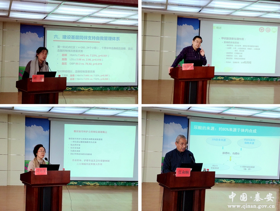 在隨后舉行的秦安縣第二屆糖尿病內(nèi)分泌學術會議上,中南大學博士研究生導師、國家內(nèi)分泌臨床重點?茖W科帶頭人、中華醫(yī)學會糖尿病專家委員會常委劉靜,博士研究生導師、中華糖尿病學會青年委員、甘肅省糖尿病學會副主任委員、省人民醫(yī)院內(nèi)分泌科主任權(quán)金星,中華護理學會糖尿病專業(yè)委員會委員、甘肅省護理專業(yè)委員會主任委員、甘肅省人民醫(yī)院大內(nèi)科及內(nèi)分泌科賈光萍,甘肅省內(nèi)分泌學會及中西醫(yī)結(jié)合學會專業(yè)委員會委員、天水市糖尿病委員會副主任委員、市第二人民醫(yī)院消化內(nèi)科及內(nèi)分泌科主任張和順分別作了題為《“基礎糖尿病防治隊伍的發(fā)展”、“甲狀腺結(jié)節(jié)”》、《“新版糖尿病指南解讀”、“甲亢的治療”》、《“糖尿病患者教育在糖尿病護理中的重要性”、“如何建設一支優(yōu)秀的護理隊伍”》、《“中國高尿酸血癥的相關疾病診療多學科專家共識解讀”》的學術報告。