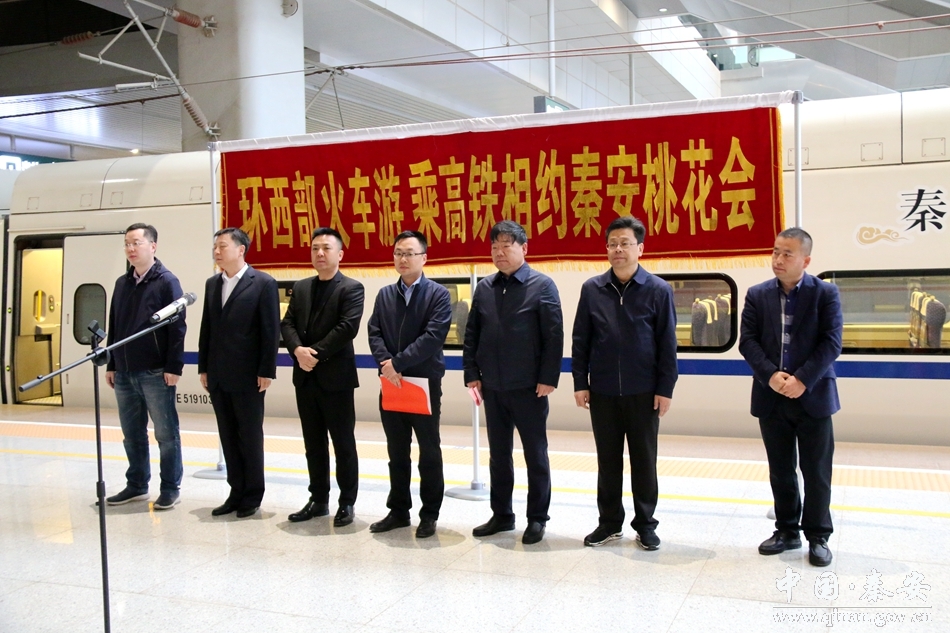開通儀式上,秦安縣政府黨組成員張強(qiáng)在致辭中說,“坐著高鐵賞桃花”活動(dòng)是2019年甘肅秦安桃花會(huì)系列活動(dòng)之一,這既是秦安全面實(shí)施鄉(xiāng)村振興戰(zhàn)略,推動(dòng)農(nóng)旅融合發(fā)展,促進(jìn)與周邊城市合作交流,助力全面打贏脫貧攻堅(jiān)戰(zhàn)的生動(dòng)實(shí)踐,也是持續(xù)放大“大地之灣•佳果秦安”品牌效應(yīng),帶動(dòng)林果支柱產(chǎn)業(yè)健康發(fā)展,拉動(dòng)經(jīng)濟(jì)增長(zhǎng)富民強(qiáng)縣的有力舉措!白哞F賞桃花”活動(dòng),旨在以花為媒、以花會(huì)友,邀請(qǐng)八方賓朋前來秦安觀景賞花、考察交流,聚集四?蜕桃黄鹎⒄労献鳌⑼顿Y興業(yè)。甘肅蘭鐵國際旅行社副總經(jīng)理連發(fā)春說,這次蘭州鐵路集團(tuán)公司蘭鐵國旅與秦安縣人民政府共同開通賞桃花專列,也是落實(shí)省委省政府旅游強(qiáng)省和中國鐵路總公司客運(yùn)提質(zhì)計(jì)劃,以及蘭州局集團(tuán)公司增運(yùn)增量和旅游扶貧的具體措施,我們想借助這次桃花會(huì)專列的開行,挖掘更多的甘肅優(yōu)質(zhì)旅游資源,為甘肅地方經(jīng)濟(jì)作出貢獻(xiàn)。