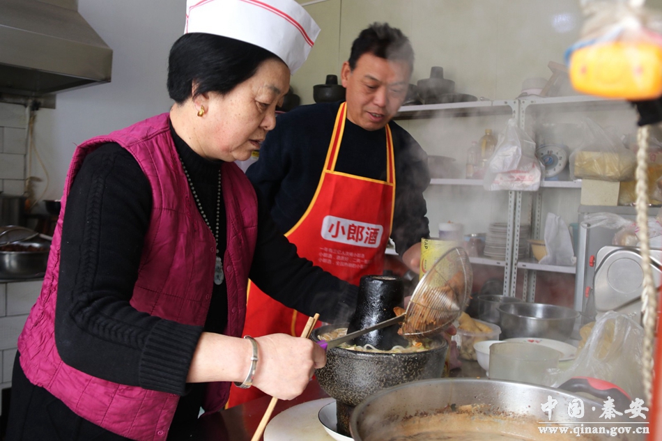 “我們的大地灣鍋?zhàn)右呀?jīng)經(jīng)營了三十多年,從五營開始到秦安縣已經(jīng)有十多年,咱們大地灣鍋?zhàn)又饕且约亦l(xiāng)味,里面有老蘿卜菜,還有土豆粉條、漿水豆腐,上面有紅燒肉、排骨、手工丸子都是咱們親自做的,沒有是以辣或者是其他味道,以咱們以前老一輩的口味來做的!贝蟮貫冲?zhàn)拥甑曛鲝埿∑礁嬖V記者。
