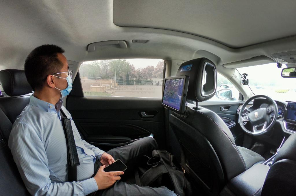 4月25日,在北京經(jīng)濟技術開發(fā)區(qū),一名乘客在體驗“主駕無人、副駕駛配備安全員”的無人駕駛車。新華社記者 彭子洋 攝