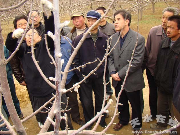 2012年3月22日,突遇寒流,氣溫驟降到零下5度,天水市歌舞團領(lǐng)導班子成員及科級干部在市文化文物出版局紀委書記、市歌舞團團長、黨支部書記吳治中同志的帶領(lǐng)下,頂風冒雪來到“聯(lián)村聯(lián)戶、為民富民”行動聯(lián)系點--清水縣賈川鄉(xiāng)董灣村開展幫扶調(diào)研。市歌舞團特意邀請了天水市果樹研究所高級農(nóng)藝師楊世勇和市果業(yè)產(chǎn)業(yè)化辦公室副主任、農(nóng)藝師徐應(yīng)斌兩位專家為農(nóng)戶授課。并帶來了果農(nóng)們急需的化肥、剪刀、花牛蘋果種植書籍。