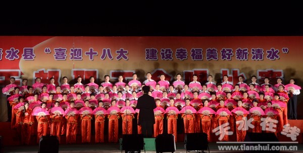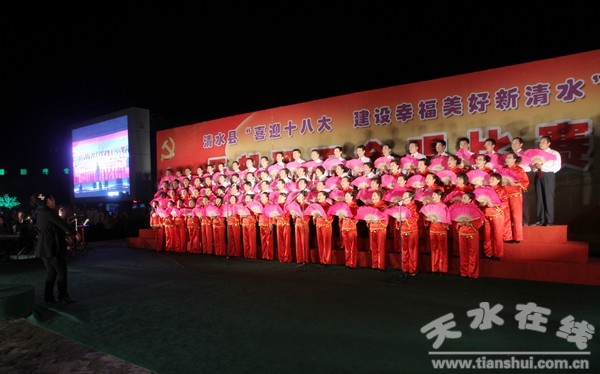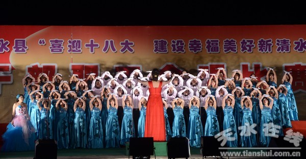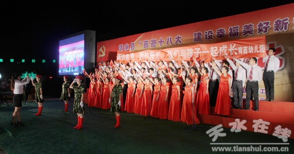 9月27日,清水縣“喜迎十八大,建設(shè)幸福美好新清水”教育系統(tǒng)干部職工合唱比賽在軒轅廣場(chǎng)進(jìn)行,來(lái)自縣六中、縣原泉小學(xué)、縣西關(guān)小學(xué)、縣一幼、縣五中、縣一中、縣三中、縣三幼、縣軒轅小學(xué)、縣東關(guān)小學(xué)、縣二幼和縣育苗幼兒園等城區(qū)12所學(xué)校代表隊(duì)上演了精彩的合唱曲目。清水縣四大組織全體在家領(lǐng)導(dǎo)及部分城鄉(xiāng)群眾共同觀看了合唱比賽。