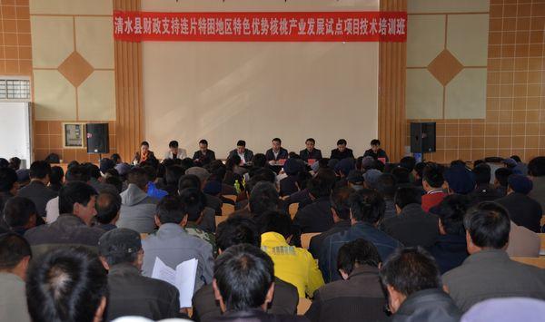 4月16日,清水縣財政支持連片特困地區(qū)特色優(yōu)勢核桃產(chǎn)業(yè)發(fā)展試點項目技術(shù)培訓(xùn)班開班?h委常委、縣政府副縣長馬利民,天水農(nóng)校副校長周偉東,縣財政局、扶貧辦、林業(yè)局、果業(yè)局等相關(guān)單位主要負(fù)責(zé)人出席開班儀式。全縣18鄉(xiāng)鎮(zhèn)分管領(lǐng)導(dǎo)、林技干部、各村果農(nóng)代表約300余人參加培訓(xùn)。