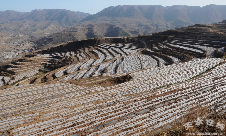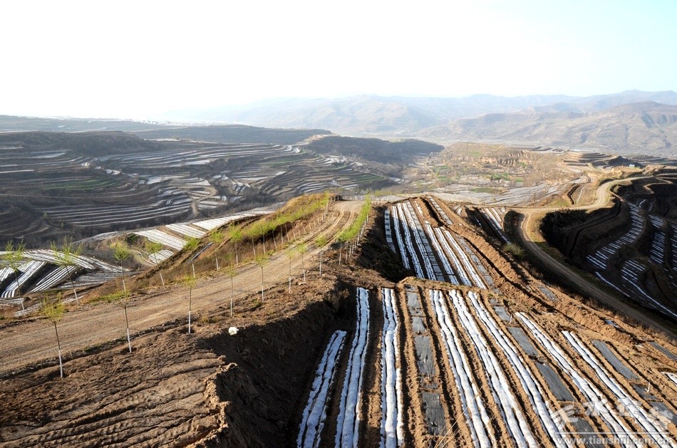 汽車沿著西靈山蜿蜒的山路盤山而上,放眼望去,平整的梯田錯落有致,上面全部覆膜栽植著核桃樹,猶如銀蛇舞動,順著山勢向遠處伸展而去,蔚為壯觀。這就是清水縣西靈山5萬畝優(yōu)質(zhì)核桃示范區(qū),目前已整合資金3600多萬元,共修梯田2萬畝,建成果園面積3.9萬畝。