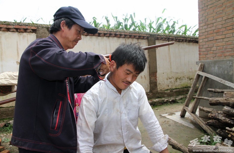 (在白沙鄉(xiāng)魯溝村小學(xué)受災(zāi)群眾安置點,村民程建明正在幫同村受災(zāi)群眾理發(fā))