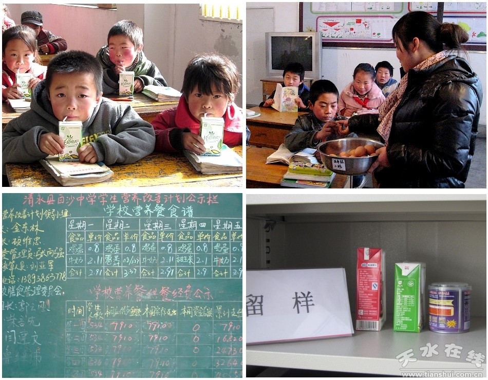 為了把這項惠民工程實施好,清水縣結(jié)合實際情況,按照“政府主導(dǎo)、因地制宜、安全第一”的原則,認(rèn)真實施,穩(wěn)步推進。供餐內(nèi)容為雞蛋、牛奶、100%蘋果汁、甜玉米罐頭和面包,供餐模式采用食堂供餐、家庭供餐和企業(yè)供餐相結(jié)合的方式,為農(nóng)村學(xué)生提供了營養(yǎng)餐。同時,該縣把營養(yǎng)改善計劃試點工作履行職責(zé)情況納入了對各部門和各鄉(xiāng)鎮(zhèn)政府的年度考核內(nèi)容,成立了專門的領(lǐng)導(dǎo)小組,建立了責(zé)任體系,開展了營養(yǎng)改善計劃食品安全知識培訓(xùn),確保了全營養(yǎng)改善計劃的順利實施。