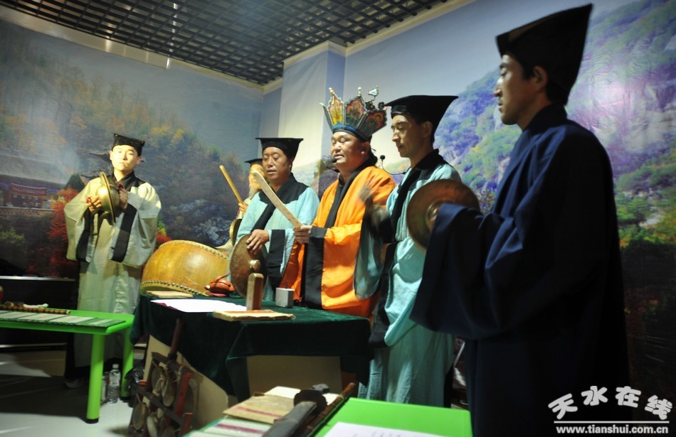 清水道教音樂(lè)源于公元12世紀(jì)的金代創(chuàng)建的全真派,其源頭出自秦漢神仙方士,重個(gè)人煉養(yǎng),以修道成仙為主旨,也兼符篆。其煉養(yǎng)術(shù)至唐宋時(shí)漸至趨向于內(nèi)丹,以鐘內(nèi)丹派為主流,至金代正式建立全真派。清水道教音樂(lè)與其道派據(jù)新編《清水縣志》記載,始創(chuàng)于明神宗萬(wàn)歷年間(公元1573-1620年),形成了“龍門(mén)”和“華山”兩個(gè)支派,長(zhǎng)期共存,各自發(fā)展。全真派以《道德經(jīng)》、《般若心徑》、《孝經(jīng)》作為經(jīng)典,推行叢林制,要求出家住觀,強(qiáng)調(diào)修真,戒除酒色財(cái)氣,除情去欲,清靜真修,以內(nèi)成真超離生死,清水道教音樂(lè)的突出特點(diǎn)是以全真正韻作為“龍門(mén)”與“華山”支派宮觀的統(tǒng)一范本,道樂(lè)一般由道士口傳口授,高功為士師秘傳,但由于十方叢林之間聯(lián)系密切,道士常四處游方,所以,在遵循瑜真正韻格范的同時(shí),也產(chǎn)生了幾種地方韻,使其道樂(lè)的風(fēng)格帶地方特色。