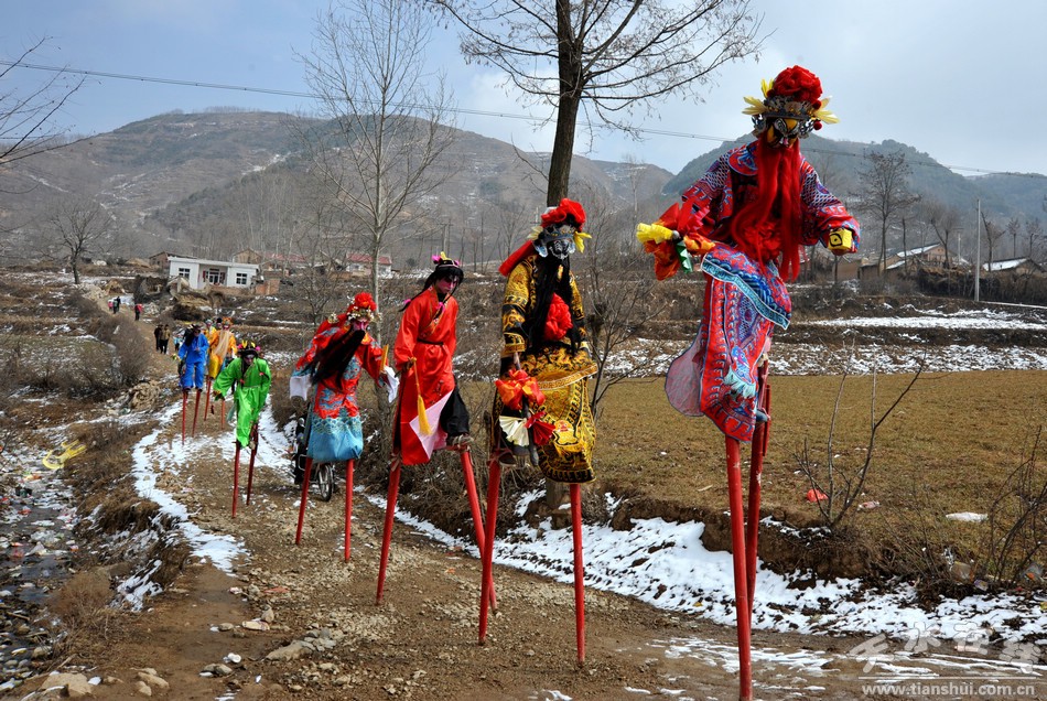 清水縣草川鋪鄉(xiāng)劉莊村高蹺長約三尺余,表演者一般為青年男子,表演者腳上綁著長木蹺,臉畫臉譜,身穿官袍,行走自如,技藝性強,形式活潑多樣,由于演員踩蹺比一般人高,便于遠近觀賞。他們扮演成喜劇人物,演出喜劇某一故事。