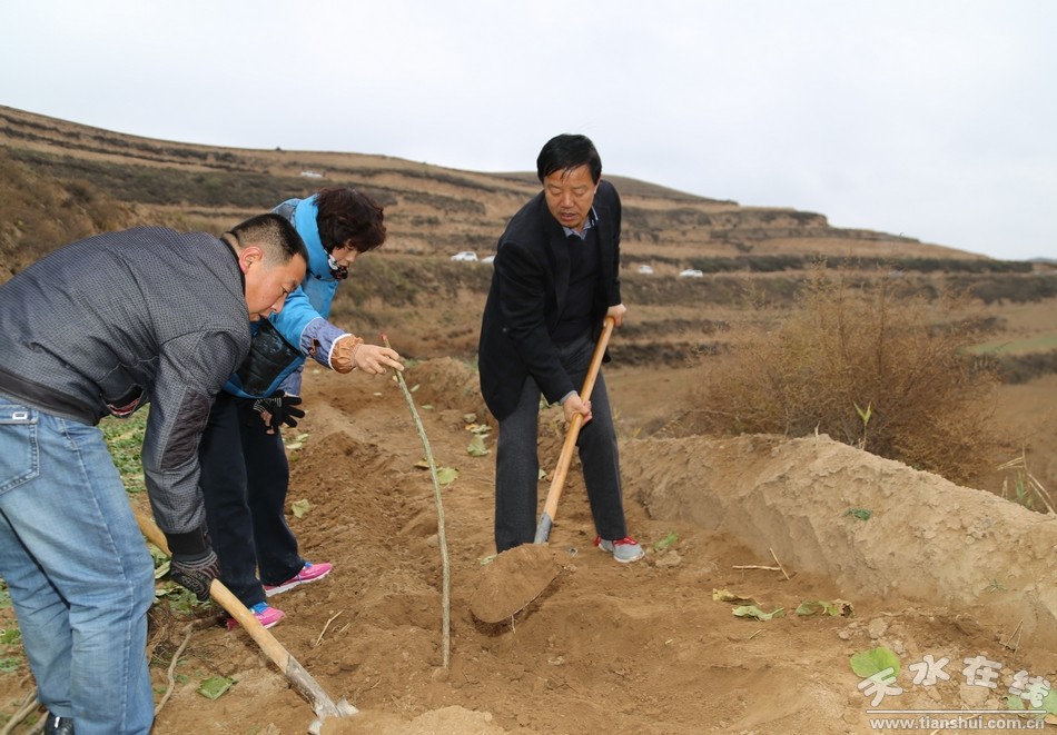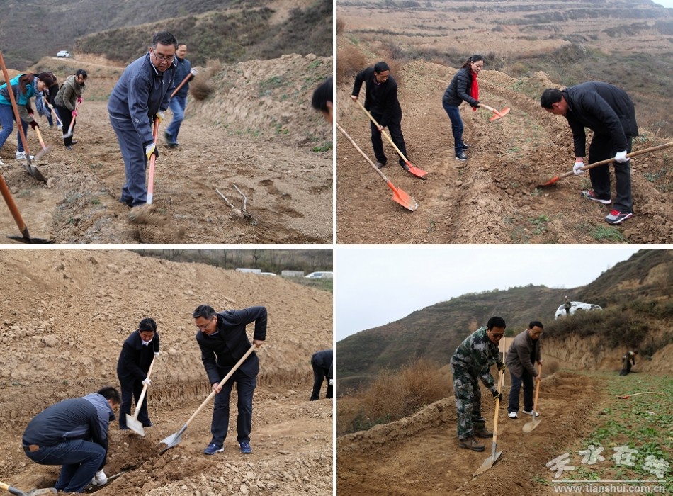 (縣領導趙愛平、楊泉、秦永斌、楊慶森與干部職工一道參加義務幫建核桃園活動)