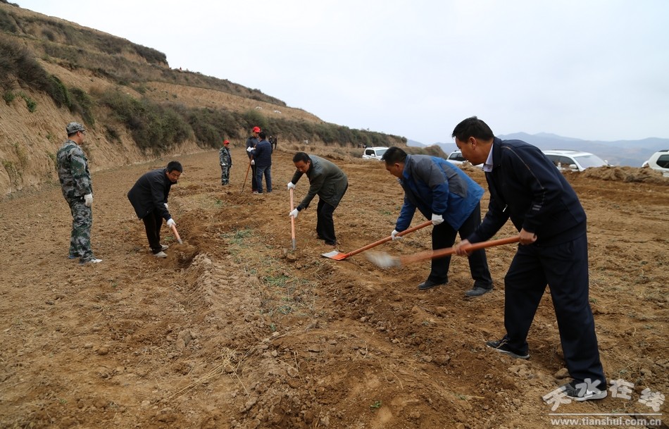 11月3日,清水縣規(guī)劃的又一個萬畝干鮮果示范點----蒲魏梁萬畝核桃基地建設工作正式啟動?h委書記劉天波,縣人大常委會主任趙云清,縣委副書記、縣政協(xié)主席王新強,縣委常委、紀委書記馬利民,縣委常委、宣傳部長張秀麗,縣委常委、組織部長周濟,縣人大常委會副主任宋宏亮、趙愛平,副縣長楊泉、秦永斌、楊慶森,縣政協(xié)副主席李應祥等縣四大組織在家領導與縣直機關和事業(yè)單位的2600多名干部職工及數(shù)百名當?shù)厝罕娨坏绤⒓恿肆x務幫建核桃園活動。