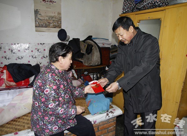 清水縣開展一系列送溫暖慰問活動(dòng),足跡遍及清水縣大街小巷、每個(gè)村落,慰問了駐地官兵、困難農(nóng)戶、五保老人、二女戶、高齡老人、殘疾人、困難黨員、困難職工、優(yōu)秀人才、道德模范、“清水好人”及退休老干部,逐戶逐人把棉被、大米、食用油等物資和節(jié)日慰問金送到他們手中,并向他們致以節(jié)日美好的祝福。“最近天氣冷,一定要注意保暖,不要感冒了,”“常年來,你們不辭辛苦,夏頂烈日、冬冒嚴(yán)寒,為提升縣城品位、改善人居環(huán)境做出了巨大的貢獻(xiàn),感謝你們”“快過年了,祝愿你們身體健康、生活愉快、家庭幸!,一句句問候,一聲聲叮囑,讓大家深深地感受到黨和政府與社會(huì)大家庭的關(guān)愛與溫暖。