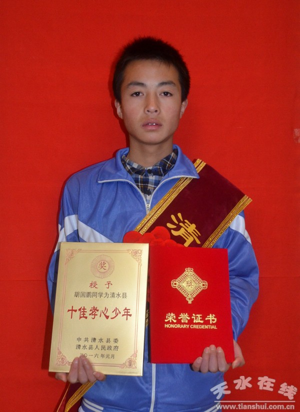 在清水縣清水縣新城鄉(xiāng)中學(xué),有這樣一位少年,他品學(xué)兼優(yōu),樂觀向上,團結(jié)友善,樂于奉獻,在家里,他更是一個孝敬爺爺奶奶,幫助父親的好孩子。他是一個全面發(fā)展、學(xué)有所長的好少年,以良好的思想品質(zhì),優(yōu)異的學(xué)習(xí)成績,全面發(fā)展的綜合素質(zhì),成為同學(xué)中的佼佼者。他就是家住新城鄉(xiāng)王堯村胡山組的胡國鵬。
