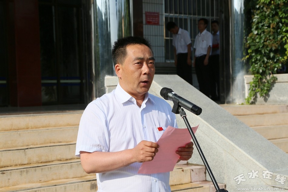 宣誓儀式上,清水縣委書(shū)記劉天波作了重要講話,要求全體領(lǐng)導(dǎo)黨員干部爭(zhēng)當(dāng)刻苦學(xué)習(xí)、與時(shí)俱進(jìn)的表率,并結(jié)合正在開(kāi)展的“兩學(xué)一做”學(xué)習(xí)教育活動(dòng),自覺(jué)踐行“四講四有”要求,帶頭成為勤奮學(xué)習(xí)、善于思考的模范,解放思想、與時(shí)俱進(jìn)的模范,勇于實(shí)踐、開(kāi)拓創(chuàng)新的模范,不斷提高理論素養(yǎng),堅(jiān)定理想信念,以過(guò)硬的政治素質(zhì)和高尚的道德情操樹(shù)立良好形象,始終保持共產(chǎn)黨員的先進(jìn)性和純潔性;要爭(zhēng)當(dāng)踏實(shí)工作、履職盡責(zé)的表率,牢記老一輩革命先烈的光榮傳統(tǒng),牢記肩負(fù)的歷史使命,時(shí)時(shí)刻刻牢記黨員這一身份,牢記黨旗下的誓言,繼承和發(fā)揚(yáng)腳踏實(shí)地、埋頭苦干的優(yōu)良作風(fēng),以不罷休的勁頭和精神面貌大膽工作,真抓實(shí)干,全力投身脫貧攻堅(jiān)、經(jīng)濟(jì)轉(zhuǎn)型、民生改善等重點(diǎn)工作,真正成為引領(lǐng)決勝全面小康的排頭兵、先遣隊(duì),以一流的業(yè)績(jī)引領(lǐng)廣大群眾再創(chuàng)佳績(jī)。要爭(zhēng)當(dāng)嚴(yán)守紀(jì)律、無(wú)私奉獻(xiàn)的表率,始終把黨章黨規(guī)牢記在心,把紀(jì)律規(guī)矩挺在前面,牢固樹(shù)立“四個(gè)意識(shí)”,堅(jiān)決抑制和糾正不良風(fēng)氣,共同營(yíng)造風(fēng)清氣正的干事創(chuàng)業(yè)氛圍。要立足崗位和個(gè)人實(shí)際,充分發(fā)揮表率作用,帶頭服務(wù)全縣工作大局,帶頭執(zhí)行組織決策部署,帶頭幫助解決群眾工作和生活困難,努力以優(yōu)良的黨風(fēng)政風(fēng)帶動(dòng)全社會(huì)風(fēng)氣根本好轉(zhuǎn),不斷開(kāi)創(chuàng)各項(xiàng)事業(yè)的新局面,為加快全面建成小康社會(huì)做出新的貢獻(xiàn)!