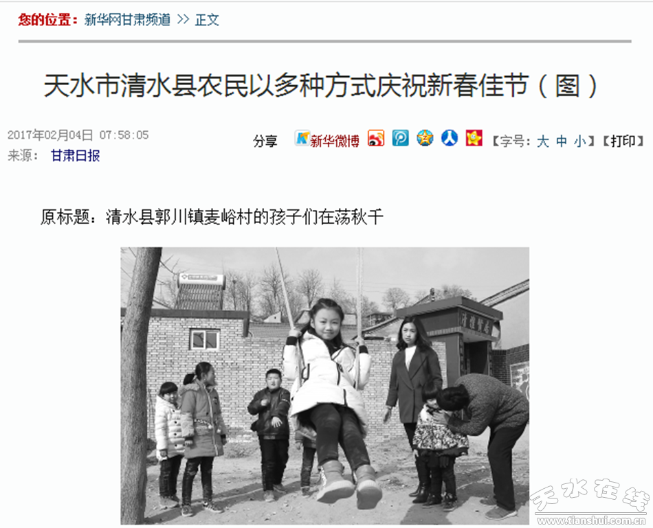 近日,清水縣郭川鎮(zhèn)麥峪村的孩子們在蕩秋千。清水縣富裕起來的農(nóng)民以多種方式慶祝新春佳節(jié)。