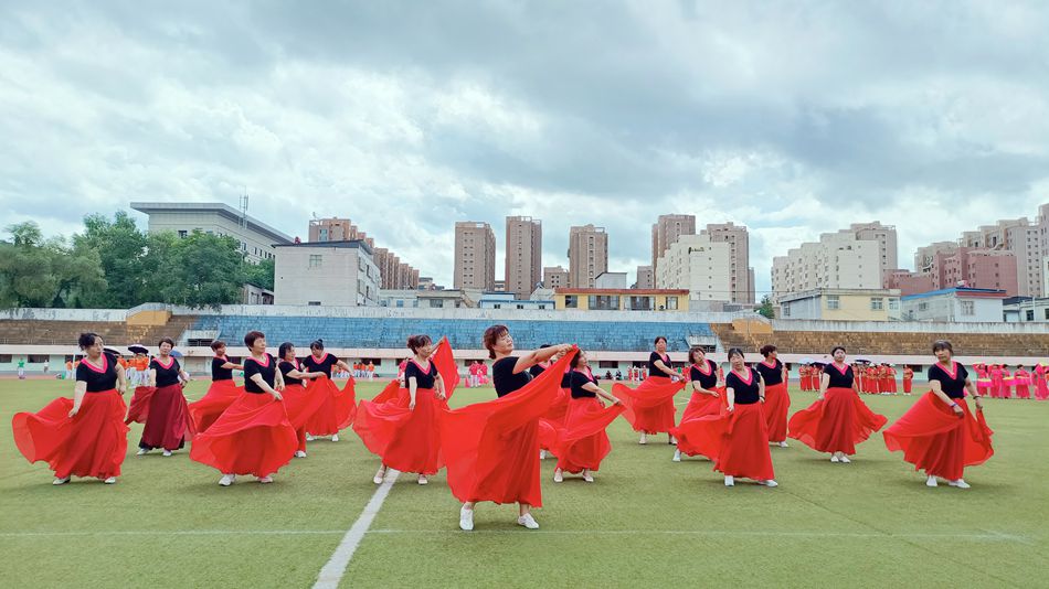 比賽開始,集體舞《奮進(jìn)新時代》的鼓點躍動全場,所有隊員邁著整齊劃一的步伐,她們精神抖擻、意氣風(fēng)發(fā)。緊隨其后的《中國范兒》《中國紅》《中國夢》等廣場舞表演中,健身操、扇子舞、響扇舞輪番上演、精彩紛呈。腰鼓表演《好日子》尤為亮眼,清脆的鼓聲中,舞者們?nèi)箶[飄揚、瀟灑唯美,燦爛的笑容讓舞臺極具感染力,現(xiàn)場喝彩歡呼聲不斷。