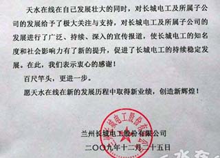 值此天水在線成立十周年之際,我們謹(jǐn)向貴網(wǎng)站致以熱烈的祝賀!