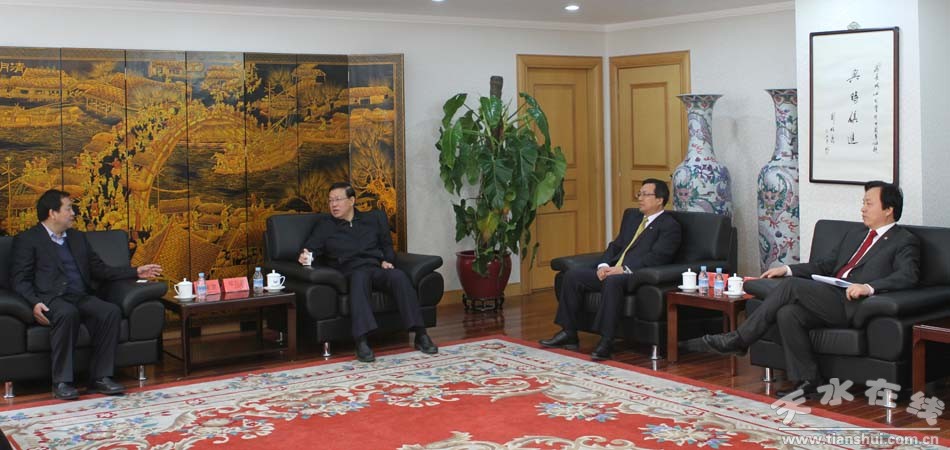 。ǜ拭C盛達(dá)集團(tuán)股份有限公司董事長(總裁)趙滿堂與中國長城資產(chǎn)管理公司總裁鄭萬春(右)、副總裁張曉松(右二)、胡建忠(右三)座談)
