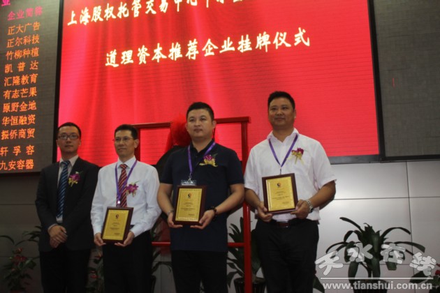 6月17日,隨著“天寶文化”股權(quán)托管掛牌上市儀式在上海股權(quán)托管交易中心隆重舉行(股權(quán)代碼:206131)。標(biāo)志著天寶文化產(chǎn)業(yè)投資(集團(tuán))有限公司正式登陸資本市場(chǎng)。天水市工商聯(lián)副主席左沁芳、甘肅省江蘇商會(huì)副會(huì)長柏傳祥、天水市經(jīng)濟(jì)合作發(fā)展中心副主任王多軍、天水市中小企業(yè)投融資服務(wù)中心副主任魏志剛及天寶文化集團(tuán)主要負(fù)責(zé)人參加了掛牌儀式。