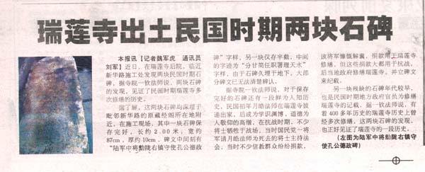 本報訊【記者魏軍虎 通訊員劉軍】近日,在瑞蓮寺后院,臨近新華路施工處發(fā)現(xiàn)兩塊民國時期石碑,據(jù)寺院一欽法師說,兩塊石碑的發(fā)現(xiàn),見證了民國時期瑞蓮寺多次修繕的歷史。