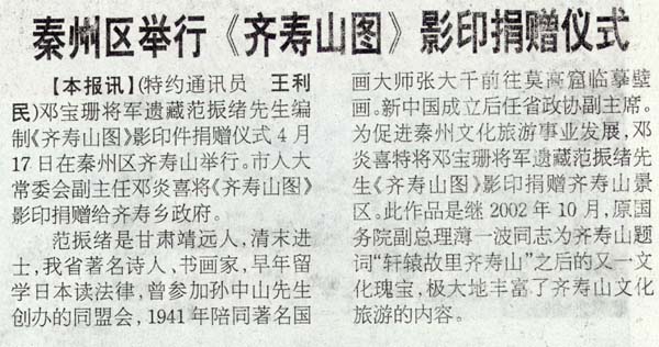 范振緒是甘肅靖遠(yuǎn)人,清末進(jìn)士,我省著名詩(shī)人、書畫家,早年留學(xué)日本讀法律,曾參加孫中山先生創(chuàng)辦的同盟會(huì),1941年陪同著名國(guó)畫大師張大千前往莫高窟臨摹壁畫。新中國(guó)成立后任省政協(xié)副主席。為促進(jìn)秦州文化旅游事業(yè)發(fā)展,鄧炎喜特將鄧寶珊將軍遺藏范振緒先生《齊壽山圖》影印捐贈(zèng)齊壽山景區(qū)。此作品是繼2002年10月,原國(guó)務(wù)院副總理薄一波同志為齊壽山題詞“軒轅故里齊壽山”之后的又一文化瑰寶,極大地豐富了齊壽山文化旅游的內(nèi)容。