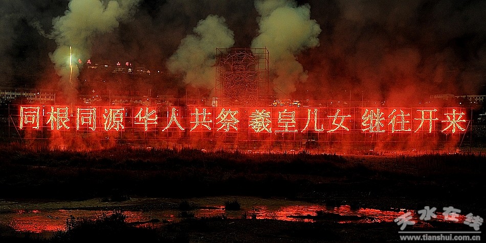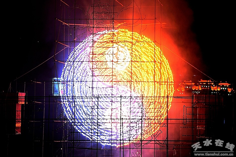 晚九點整,音樂焰火晚會正式拉開了序幕。綠牡丹、黃千輪、金波藍、色連珠花以及各式中空禮花,穿插特效花束、燭光、虎尾等組合電腦特技表演的效果,活力四射、青春律動、把和諧之美展示無余。絢爛的焰火爭奇斗艷,相互輝映,映亮了整個秦州夜空。