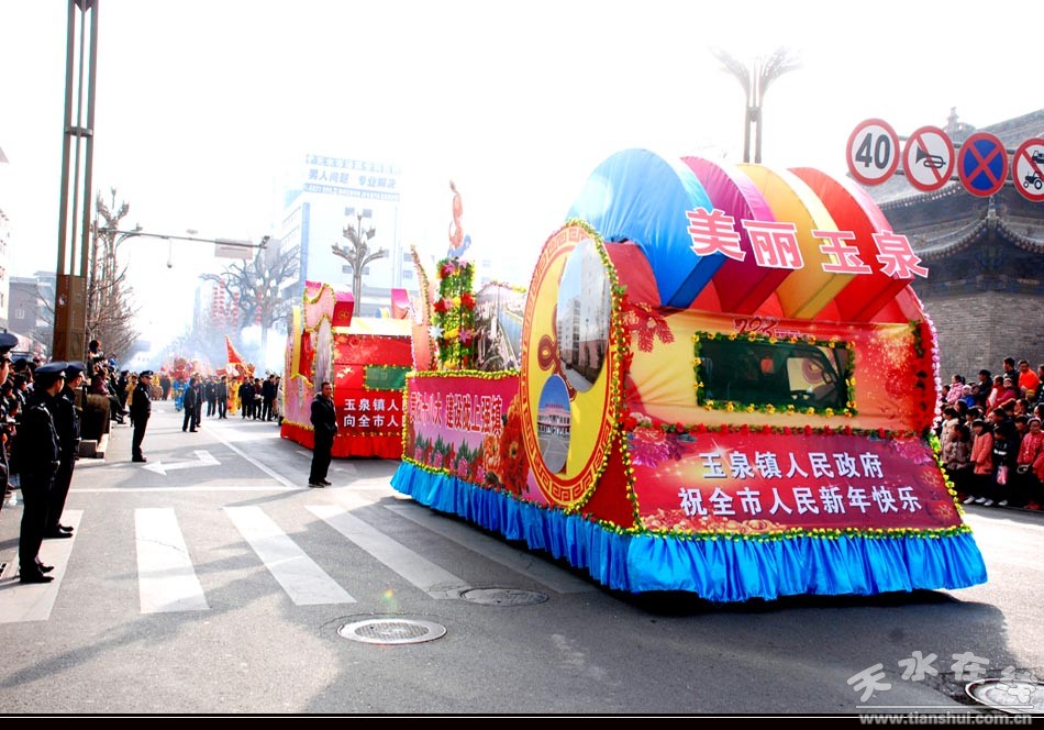 來自秦州區(qū)鄉(xiāng)鎮(zhèn)和各街道社區(qū)的彩車、高臺(tái)、舞龍舞獅、跑旱船、杠老爺、武術(shù)等內(nèi)容豐富且各具特色的社火表演緩緩從東橋頭途徑建設(shè)路、民主路到龍城廣場(chǎng)。