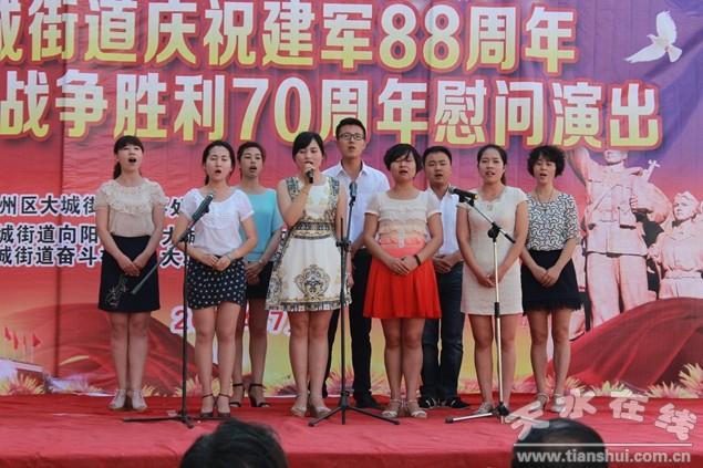在中國人民解放軍88周年即將來臨之際暨抗戰(zhàn)勝利70周年。7月28日上午,大城街道辦事處隆重舉行軍民聯(lián)歡文藝演出,全體軍休人員歡聚一堂,載歌載舞,同慶“八一”建軍節(jié),共敘軍民魚水情。