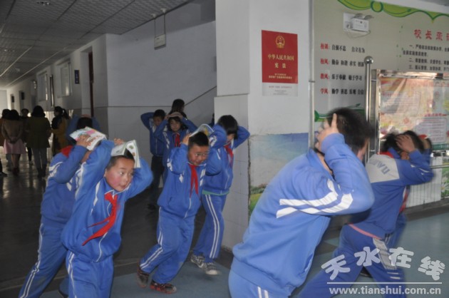 下午四時許,在棗園巷小學校園里,隨著“地震”信號的發(fā)出,在教室內上課的學生在老師的指揮下,立即將身體蜷縮,用手護住頭部,迅速躲在課桌下進行應急避震,待“主震”結束后,1000余名同學在老師的組織下雙手護頭,快速有序的撤出教室,并按演練方案規(guī)定的疏散路線迅速撤離到安全場所。在此次演練中,師生配合默契、疏散路線清楚、組織有條不紊。通過演練,增強了師生防震減災意識,提高了自救互救能力。