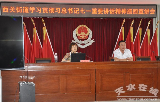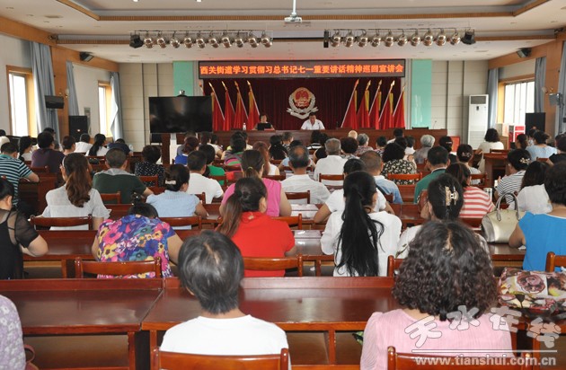 為深入學(xué)習(xí)習(xí)近平總書(shū)記“七一”重要講話精神,不斷深化對(duì)講話精神的領(lǐng)會(huì)和把握,更好地把思想和行動(dòng)統(tǒng)一到講話精神上來(lái),8月22日上午,西關(guān)街道在秦州區(qū)地稅大廈七樓會(huì)議室,組織開(kāi)展了學(xué)習(xí)習(xí)總書(shū)記“七一”重要講話精神巡回宣講會(huì),邀請(qǐng)了區(qū)委黨校王銀英老師進(jìn)行授課。街道班子成員、站所負(fù)責(zé)人、街道社區(qū)全體黨員、支部書(shū)記120余人參加了學(xué)習(xí)。