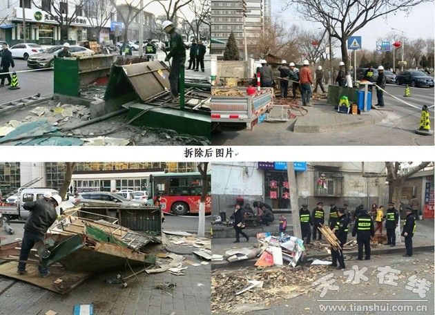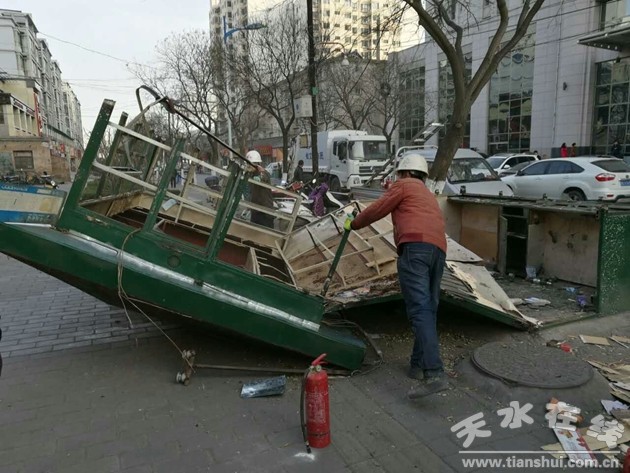 1月19日,秦州區(qū)執(zhí)法局組織執(zhí)法人員30名,雇用專業(yè)拆除人員10名,氧焊切割設(shè)備3套,對永慶東路、中醫(yī)院西側(cè)人行道上3處面積約16平方米的占道廢舊報刊亭實施了集中拆除。