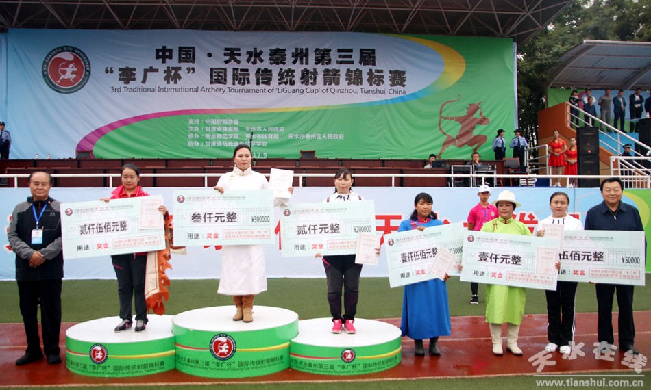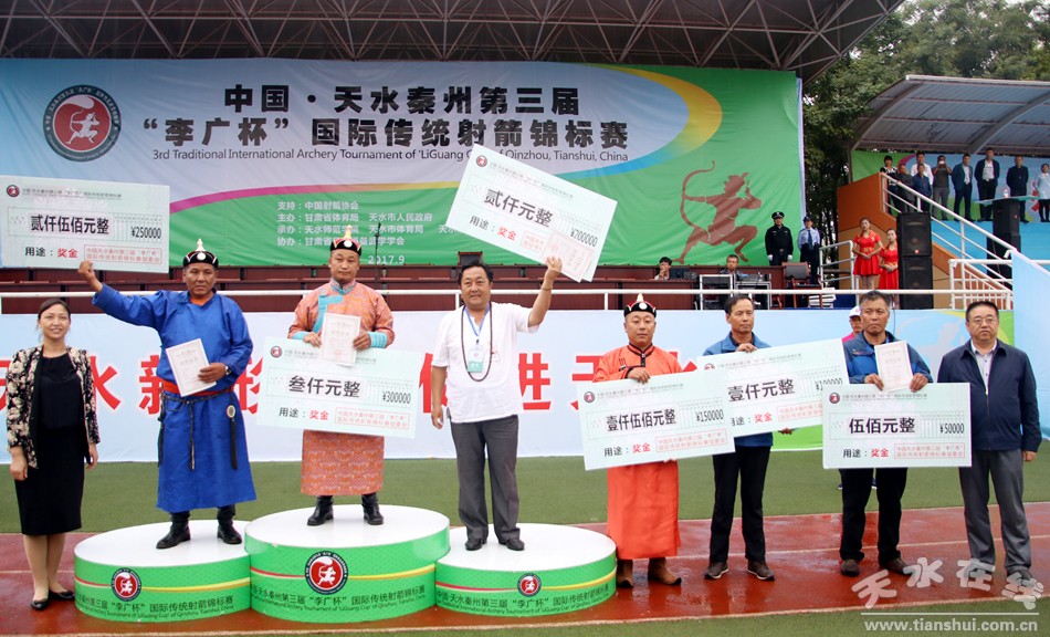 天水市委常委、秦州區(qū)委書記雷鳴宣布第三屆“李廣杯”國際傳統(tǒng)射箭錦標(biāo)賽閉幕,并為獲勝者頒獎。