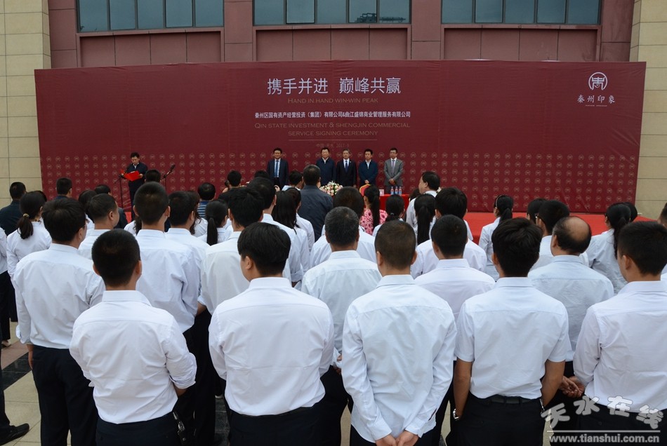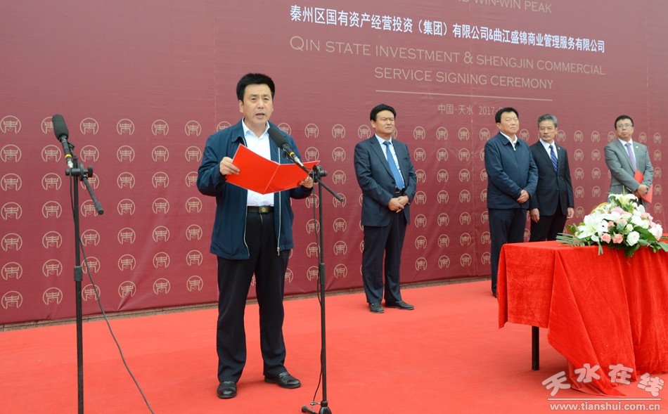 市委常委、秦州區(qū)委書記雷鳴出席,區(qū)委副書記、區(qū)長劉文璽致辭, 區(qū)政府副區(qū)長羅增芳主持儀式。 秦州區(qū)國投公司總經(jīng)理王剛平及西安曲江集團(tuán)盛錦商服公司董事長、總經(jīng)理馬更正,物業(yè) 總監(jiān)、拓展總監(jiān)魏西京參加簽約儀式。
