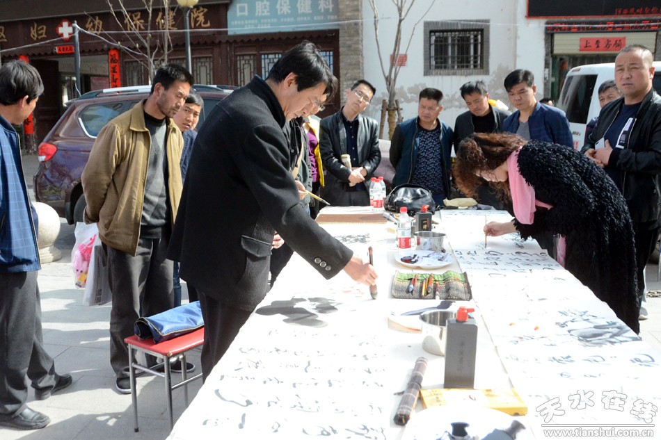 記者在秦州劇院門前看到,秦州區(qū)文聯(lián)組織區(qū)書法家協(xié)會和區(qū)美術(shù)家協(xié)會的近10位書畫家,在滿街香氣四溢的玉蘭古巷,開展了“翰墨抒情品玉蘭”書畫筆會活動,以水墨丹青作畫生動地記錄盛開的玉蘭景象。