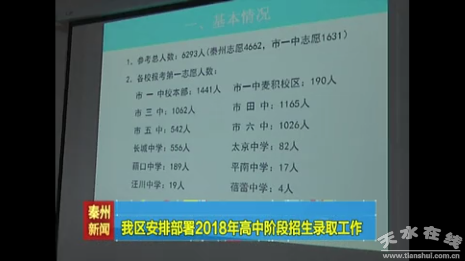 秦州區(qū)2018年市教育局下達高中招生計劃為4750人,其中,天水一中本部招生1000人(秦州區(qū)550人,外縣招生450人),秦州區(qū)區(qū)屬高中計劃招生3750人。與往年相比,秦州區(qū)今年重新規(guī)范了普通高中錄取順序,依次為天水一中(省級示范性高中)、天水三中(市級示范性高中)、天水四中(市級示范性高中)、天水五中、天水六中、長城中學、農村高中及蓓蕾高中。錄取中,將嚴格按照考生所報志愿,優(yōu)先從第一志愿進行錄取,如果第一志愿滑檔,再從第二志愿進行錄取,若考生所報志愿全部滑檔,將嚴格按秦州區(qū)普通高中錄取順序錄取。