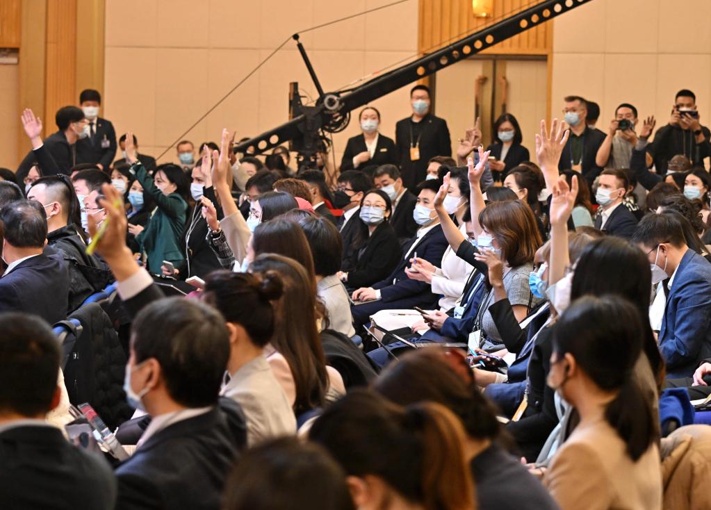 3月7日,十四屆全國(guó)人大一次會(huì)議在梅地亞中心舉行記者會(huì),外交部長(zhǎng)秦剛就中國(guó)外交政策和對(duì)外關(guān)系回答中外記者提問(wèn)。這是記者在現(xiàn)場(chǎng)舉手提問(wèn)。新華社記者 李鑫 攝