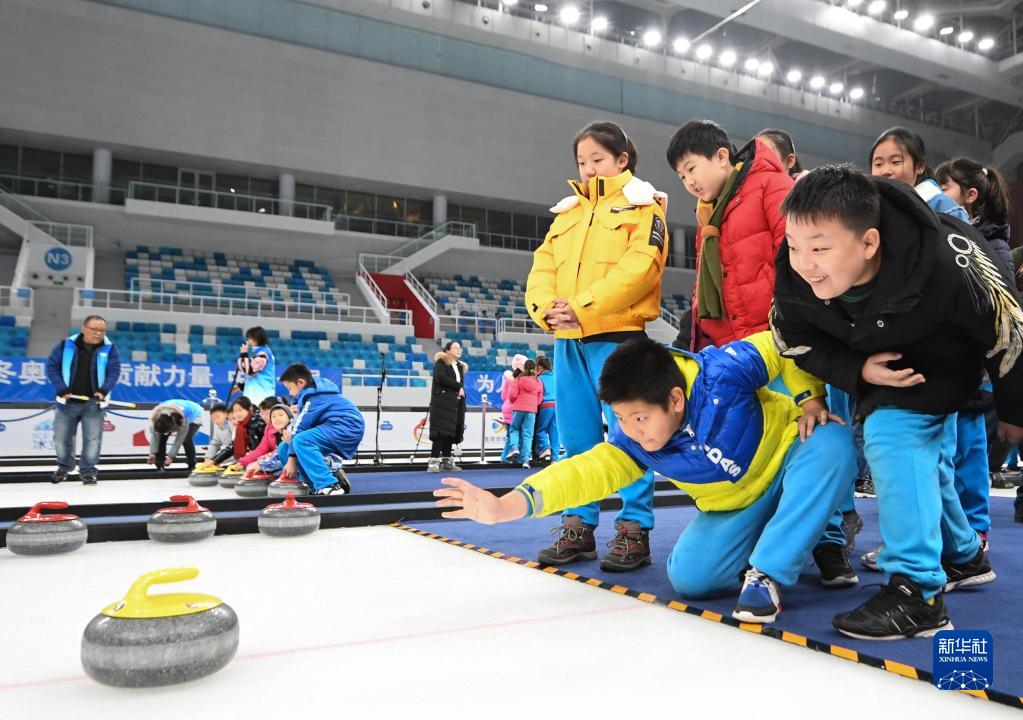 2019年12月10日,北京史家實驗學校的學生在“冰立方”體驗冰壺。新華社記者 鞠煥宗 攝
