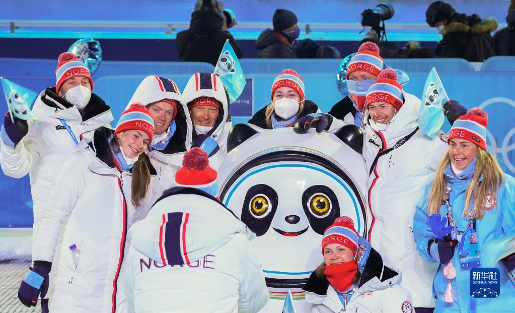 2月14日,觀眾在頒獎(jiǎng)廣場(chǎng)與“冰墩墩”合影。新華社記者丁汀攝
