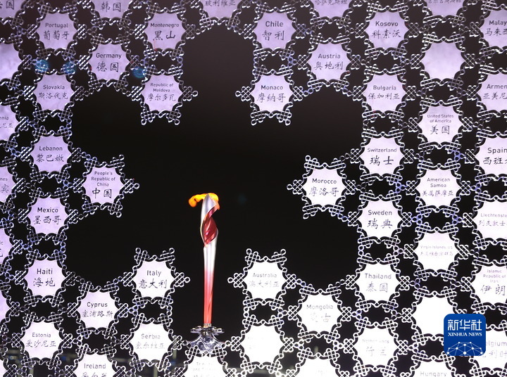 華燈初上,國家體育場璀璨奪目,宛若身披霓裳,在浩瀚夜空下熠熠生輝。“鳥巢”外,“大雪花”火炬上微火靜靜燃燒。